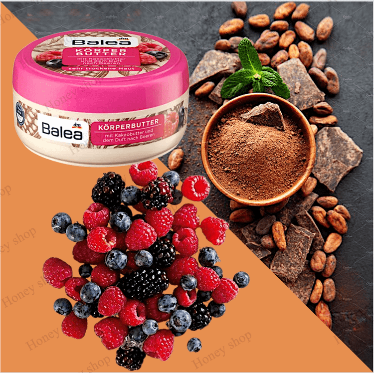 کره بدنBalea با رایحه کره کاکائو و انواع بری، باعث آبرسانی و رطوبت رسانی عمیق به پوست میشود.