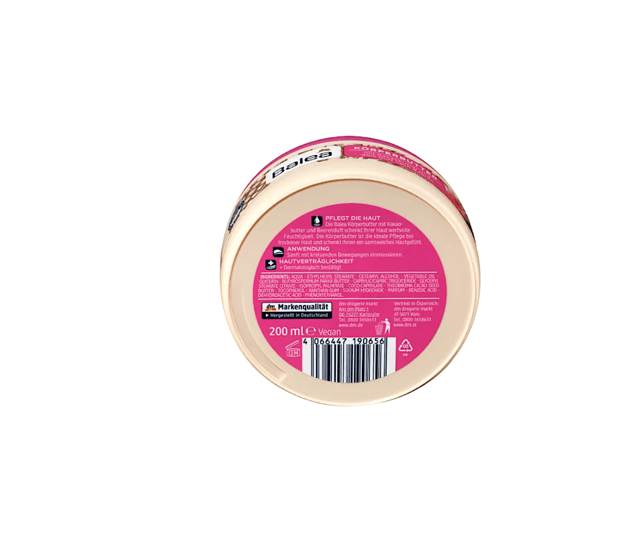 کره بدنBalea با رایحه کره کاکائو و انواع بری، باعث آبرسانی و رطوبت رسانی عمیق به پوست میشود.