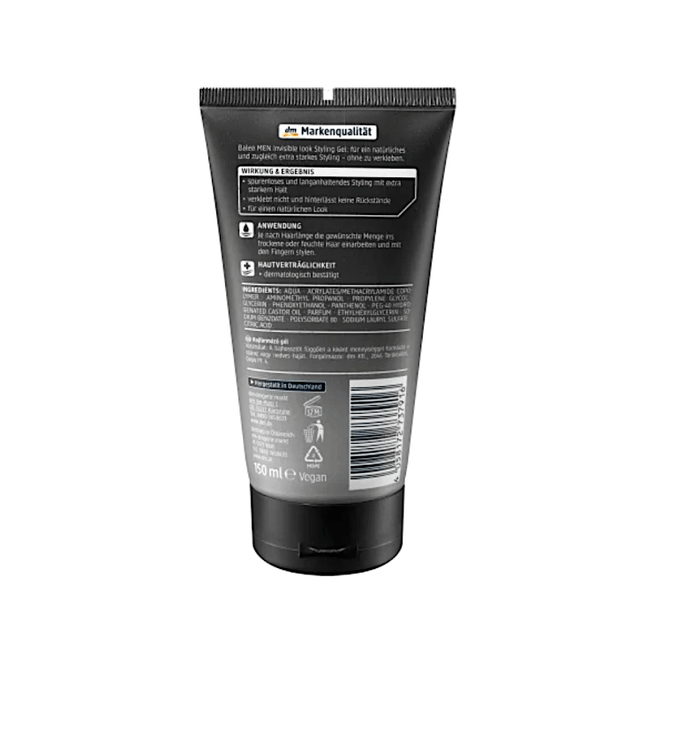 ژل استایلینگ Balea MEN Invisible Look استحکام بیشتری را بدون چسبندگی تضمین میکند و حالت دادن بدون ردیابی را امکان پذیر می کند. این به این معنی است که ظاهر شما طبیعی خواهد بود و استایل شما ماندگار خواهد بود - با چسبندگی فوق العاده قوی و بدون باقی مانده ژل روی موها.