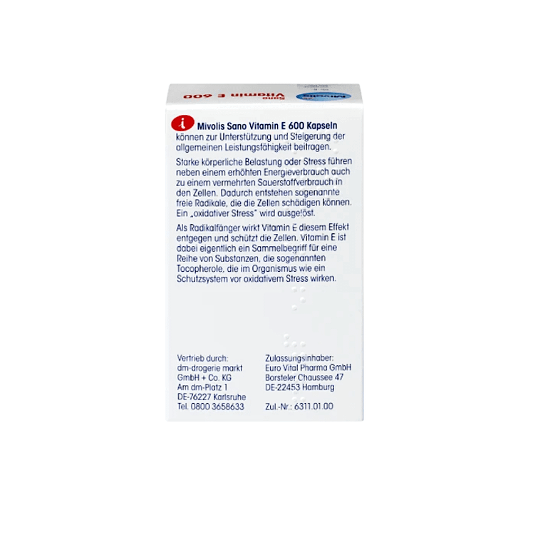 کپسول Mivolis Sano Vitamin E 600 میتواند به حمایت و افزایش عملکرد عمومی کمک کند. علاوه بر افزایش مصرف انرژی، فشار فیزیکی سنگین یا استرس نیز منجر به افزایش مصرف اکسیژن در سلول ها میشود که باعث آزادسازی رادیکال های آزاد میشود که میتواند به سلول ها آسیب برساند.