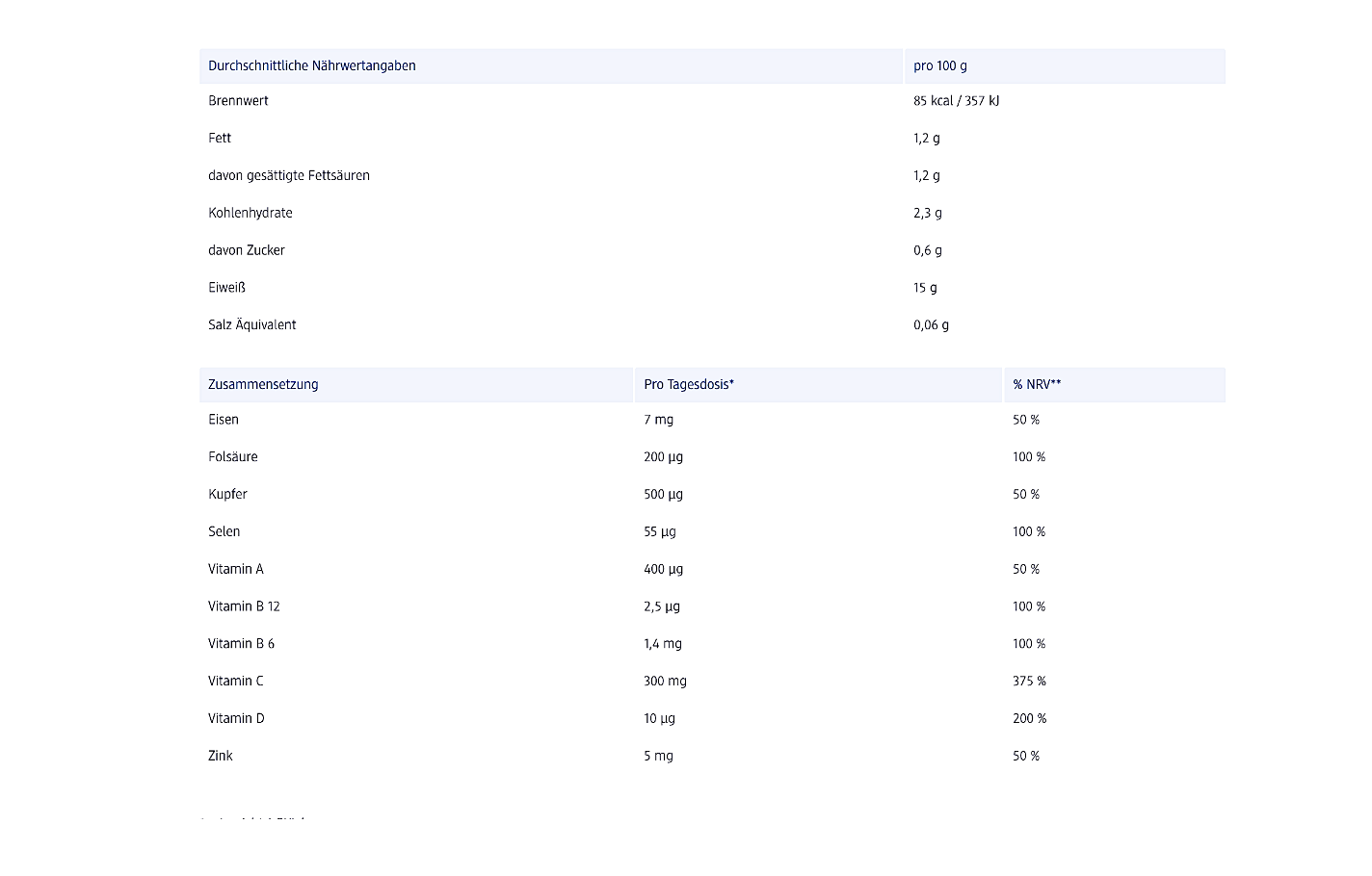 حاوی آهن، اسید فولیک، مس، سلنیوم، ویتامین A، ویتامین B12، ویتامین B6، ویتامین C، ویتامین D و روی