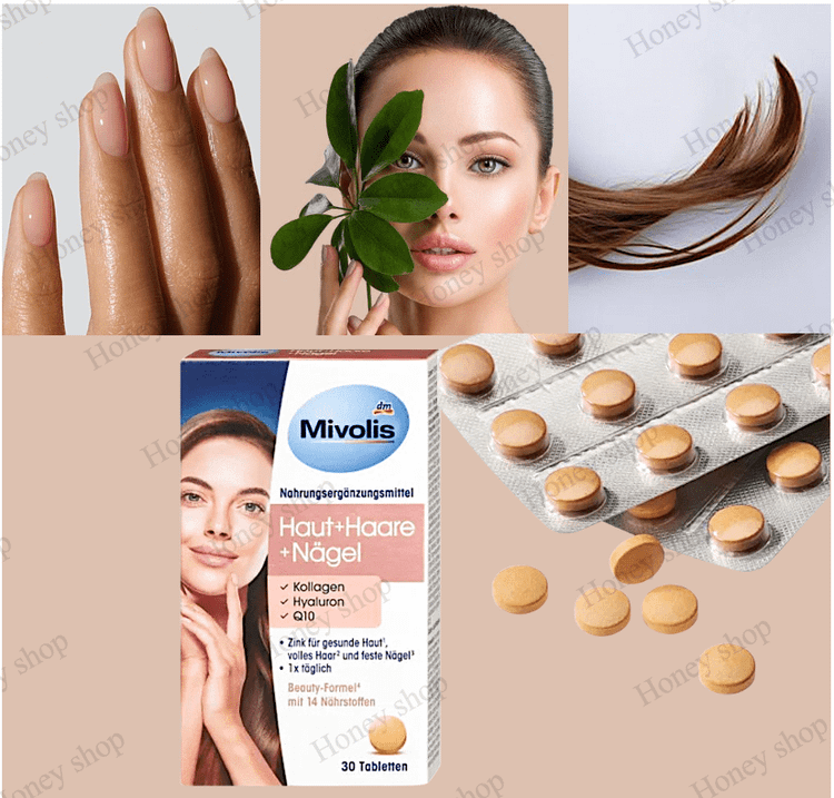 مکملMivolis Skin + Hair + Nails حاوی کلاژن، اسید هیالورونیک، کوآنزیم Q10 و فرمول ویژهای از 14 ماده مغذی هماهنگ شده است.