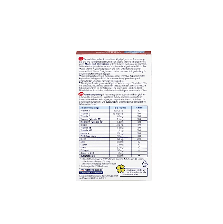 مکملMivolis Skin + Hair + Nails حاوی کلاژن، اسید هیالورونیک، کوآنزیم Q10 و فرمول ویژهای از 14 ماده مغذی هماهنگ شده است.
