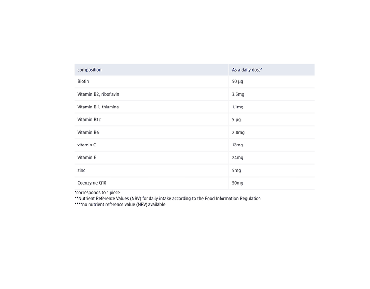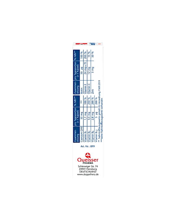 محصول بدون لاکتوز و گلوتن Doppelherz Active Coenzyme Q10 حاوی ویتامین های B و همچنین ویتامین C و روی است.