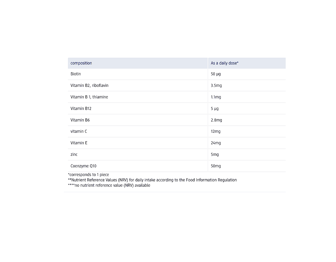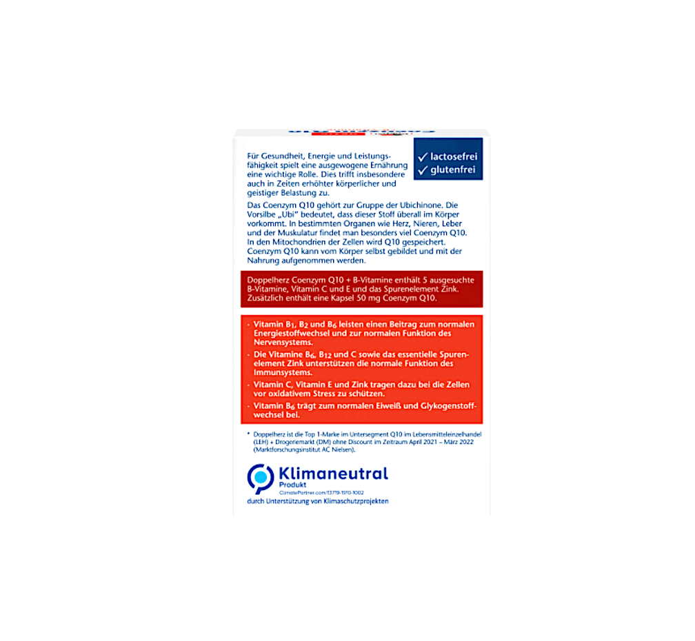 محصول بدون لاکتوز و گلوتن Doppelherz Active Coenzyme Q10 حاوی ویتامین های B و همچنین ویتامین C و روی است.