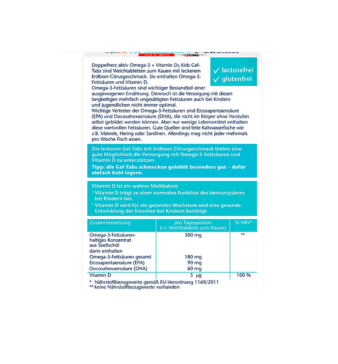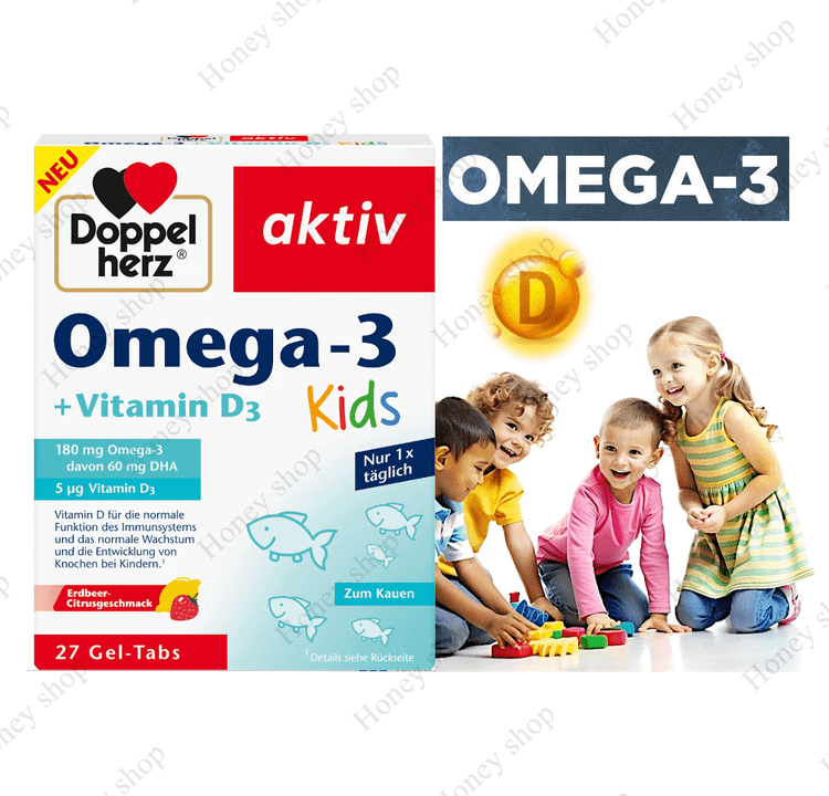 این مکمل حاوی 180 میلیگرم امگا 3 و همچنین ویتامین D3 است که می تواند از عملکرد طبیعی سیستم ایمنی و رشد طبیعی استخوان ها حمایت کند. علاوه بر این، مکمل غذایی طعم میوه ای خوشمزه ای مانند توت فرنگی و مرکبات دارد.