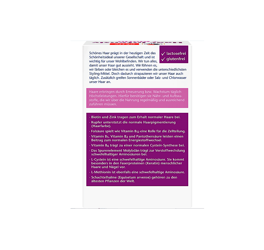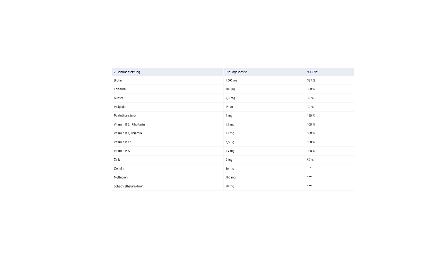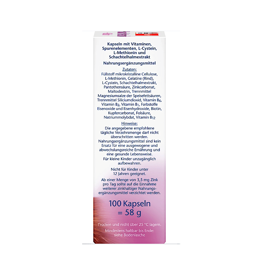 کپسول Haar Intensiv + Biotin از Doppelherz حاوی ترکیبی دقیق از ویتامینها، عناصر کمیاب، ال متیونین، ال سیستئین و عصاره دم اسب است.