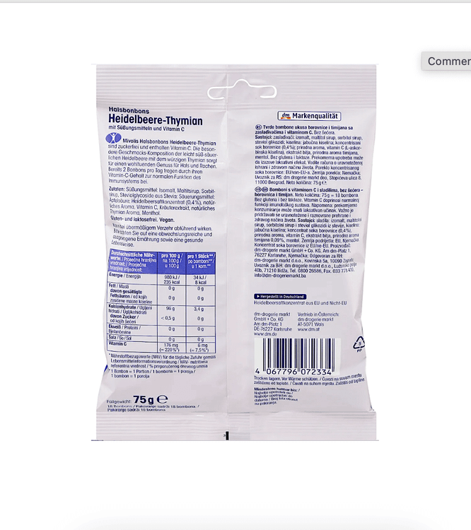 پاستیل گلو بلوبری- آویشن Mivolis بدون قند و حاوی ویتامین C است. ترکیب طعمی خاص از زغال اخته کمی شیرین و ترش با آویشن تند یک درمان آرام بخش برای گلو و حلق ایجاد می کند. فقط 2 آب نبات در روز به دلیل داشتن ویتامین C به عملکرد طبیعی سیستم ایمنی بدن کمک می کند.