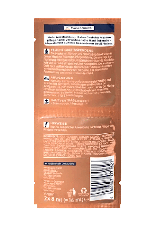 ماسک صورتBalea White Mango & Maracuja پوست را به شدت تغذیه و نرم میکند. فرمولاسیون خامهای با اسید هیالورونیک، رطوبتی تسکیندهنده ایجاد میکند و به پوست احساس نرمی مخملی میدهد.