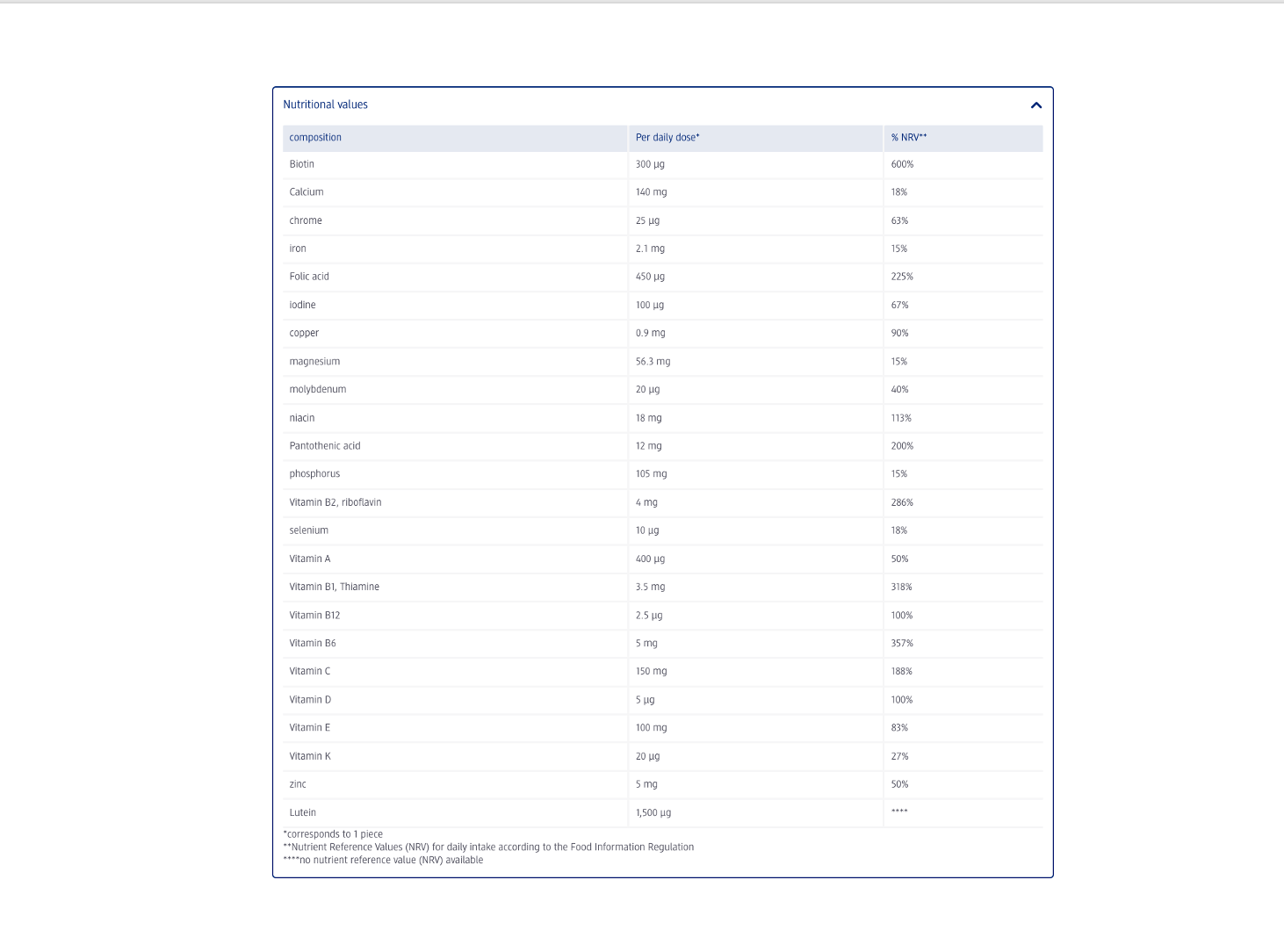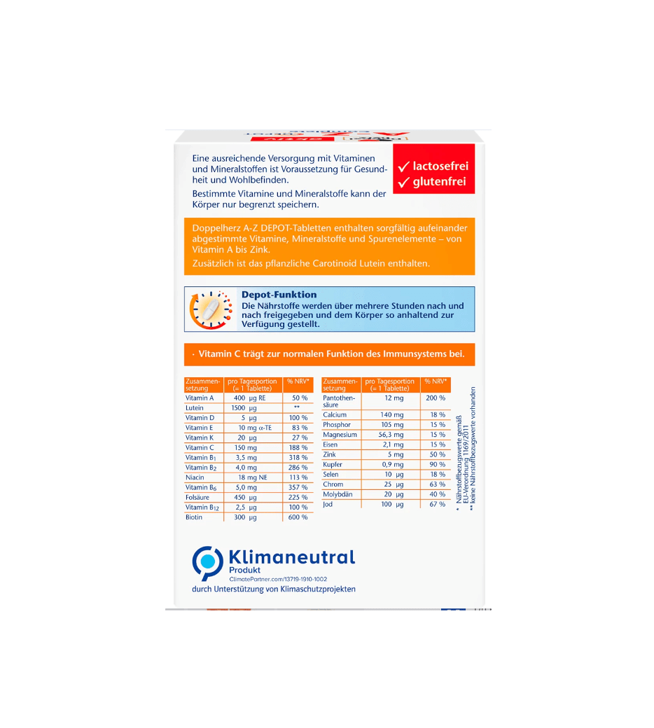 قرصهای Doppelherz aktiv AZ Depot حاوی ویتامینها، مواد معدنی و عناصر کمیاب از ابتدا تا انتهای الفبا هستند. به لطف اثر دپو، مواد تشکیلدهنده مکمل غذایی به مرور زمان در بدن آزاد میشوند و در طول روز به طور مداوم بدن را تأمین میکنند.
