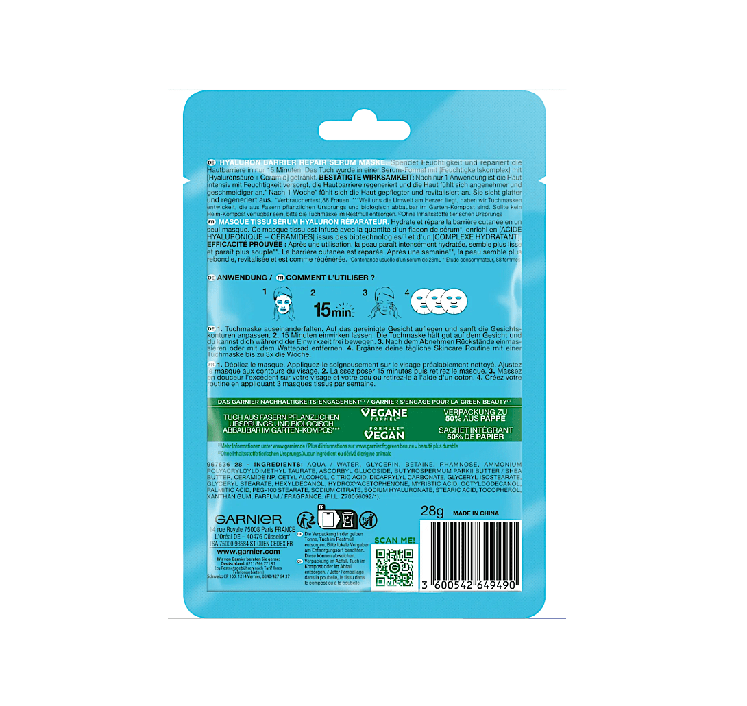 ماسک ورقهای گارنیه اسکین اکتیو سرم هیالورون بریر ریپیر گارنیر