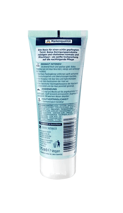 ژل لایه بردارBalea حاوی ده درصد آلوئه ورا است و پوست شما را شفاف، تمیز و صاف میکند. دانههای لایه بردار بامبو به آرامی سلولهای مرده پوست و سبوم اضافی را از بین میبرند. فرمول حاوی آلوئه ورا و هیدروکمپلکس از خشک شدن پوست جلوگیری میکند. علاوه بر این، تعادل رطوبت طبیعی پوست حفظ می شود و منافذ پوست را به صورت عمقی پاک میکند و بافت پوست را اصلاح میکند.