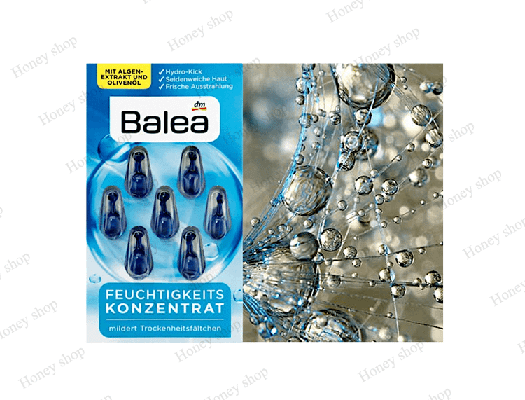 کنسانتره رطوبت Balea با ویتامینE و روغن زیتون خطوط ناشی از خشکی پوست را کاهش می دهد و در صورت استفاده منظم رطوبت شدیدی را برای پوست فراهم میکند. روغن زیتون سرشار از اسیدهای چرب غیراشباع است و به بازسازی پوست کمک میکند و با تغذیه پوست، آن را نرم و لطیف میکند. ویتامین E دارای خواص پاک کنندگی رادیکالهای آزاد است و بنابراین از پوست در برابر تأثیرات محیطی مربوط به اشعه ماوراء بنفش محافظت میکند.