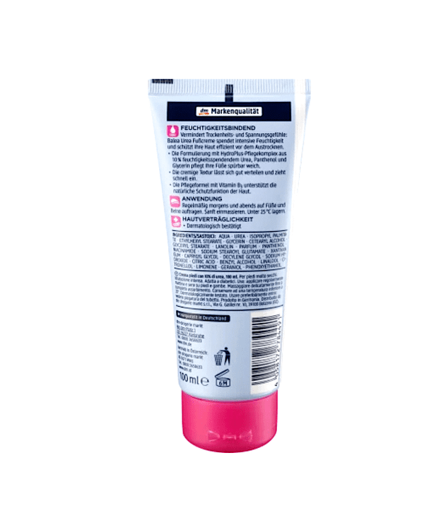 کرم پایBalea با10٪ اوره رطوبت شدیدی را فراهم میکند و به طور موثر از پوست شما در برابر خشکی محافظت میکند. فرمولاسیون کمپلکس مراقبتی هیدروپلاس که از 10% اوره مرطوب کننده، پانتنول و گلیسیرین ساخته شده است، به طور قابل توجهی از پاهای شما مراقبت میکند.