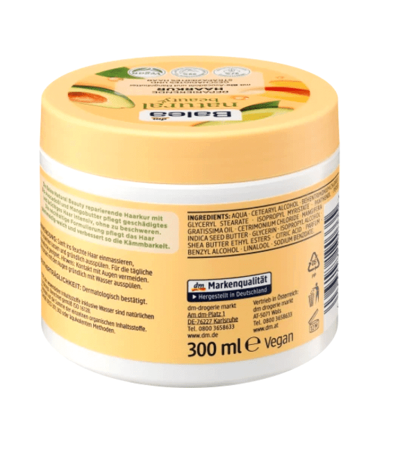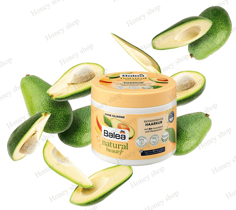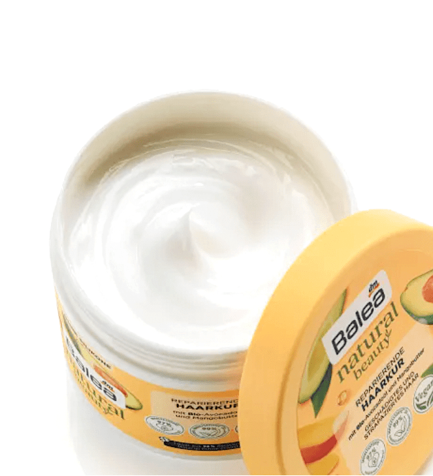 ماسک Balea Natural Beauty حاوی روغن ارگانیک آووکادو و کره انبه است و به شدت از موهای آسیب دیده و شکننده بدون سنگین کردن آنها مراقبت میکند.