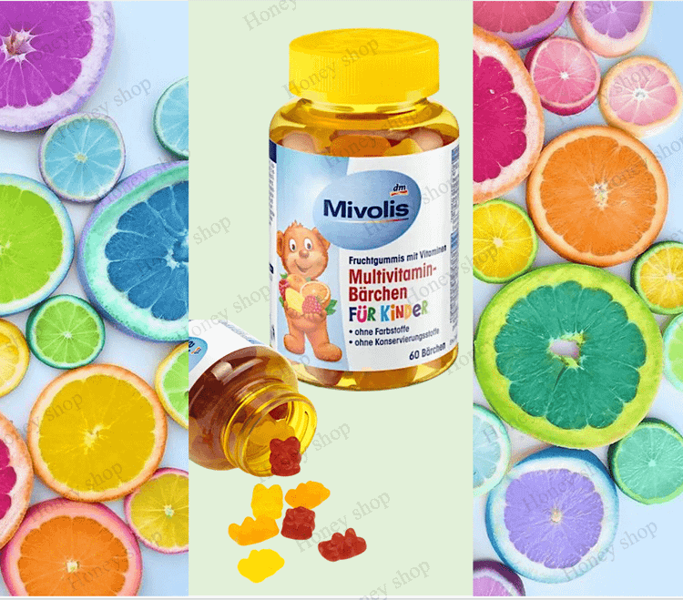 خرس های مولتی ویتامین Mivolis برای کودکان، صمغ میوه های خوشمزه ای هست که حاوی ویتامین های B1، B2، B6، B12، C E، و اسید پانتوتنیک، بیوتین و نیاسین است.