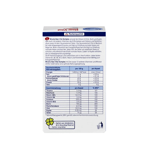 همچنین این محصول حاوی مس است که به حفظ رنگدانه مو کمک میکند. ویتامینهای B مکمل یکدیگر هستند و در عملکرد خود از یکدیگر حمایت میکنند و ویتامینهایB1، B2، B6، B12، بیوتین، نیاسین و اسید پانتوتنیک به متابولیسم انرژی کمک میکنند.