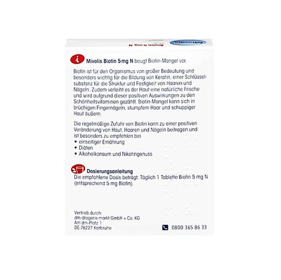 محصول Mivolis Biotin 5 m از کمبود بیوتین جلوگیری میکند. بیوتین برای تشکیل کراتین، مادهای کلیدی برای ساختار و استحکام مو و ناخن است. علاوه بر این به پوست طراوت طبیعی میبخشد و با توجه به این اثرات مثبت جزو ویتامینهای زیبایی محسوب میشود.
